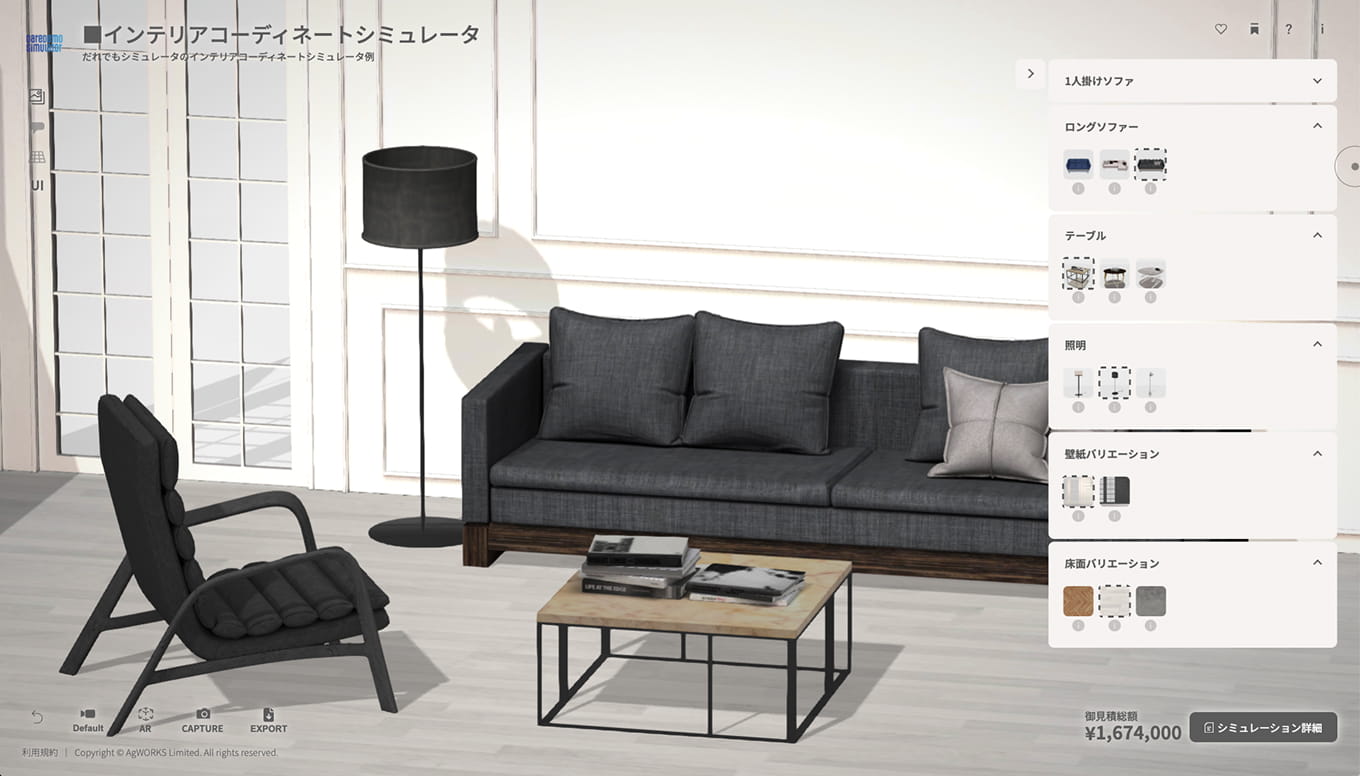 | NEWS | 2025.11.22 | 家具の3Dシミュレータ、サンプル無償で開発のお知らせ |