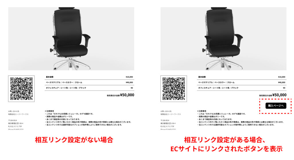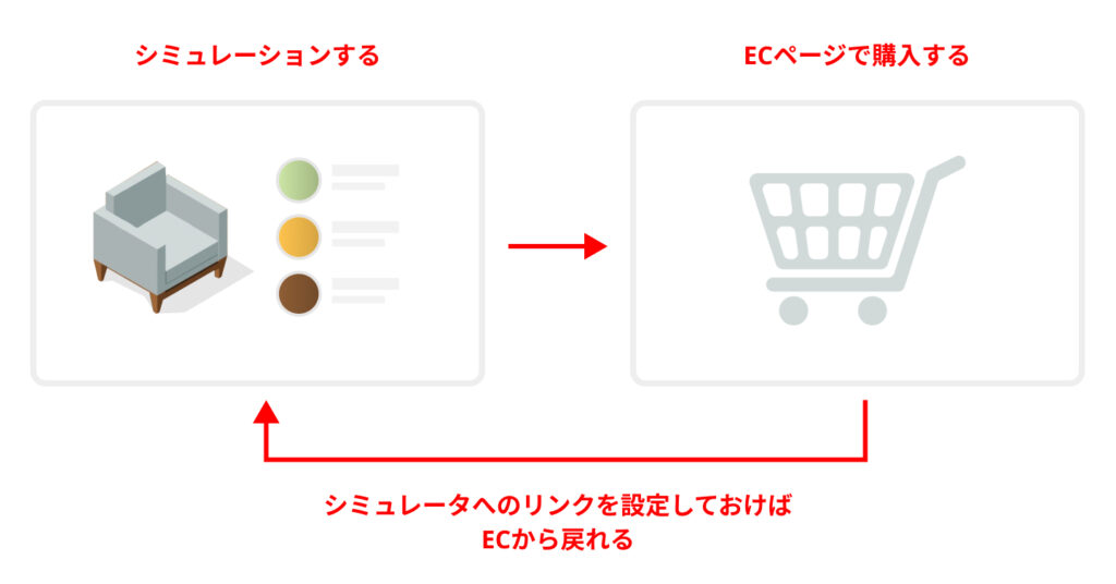 ユーザーは、「商品をカスタマイズする」→「そのままECサイトで購入する」といったフローをシームレスに行える様になります。また、ECページの方にシミュレータのURLを設定しておけばECからシミュレータに戻る、といった操作も可能になります。